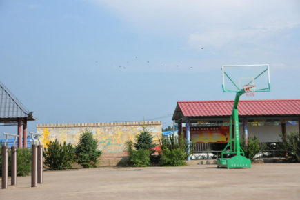 双胜村篮球架、健身器材。良好生态吸引群鸟飞过