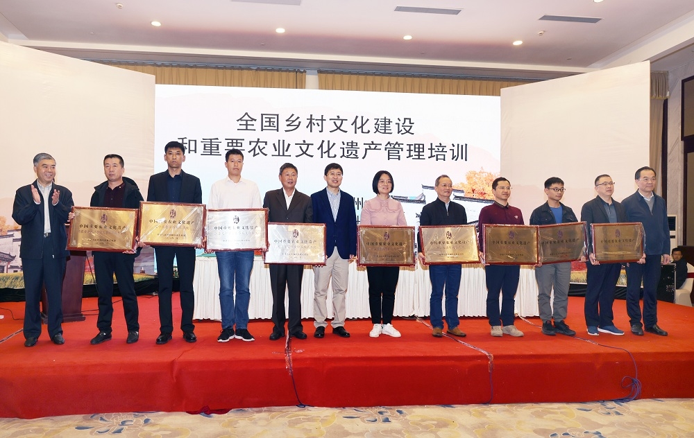 为贯彻落实中央乡村文化振兴相关政策精神,加强乡村文化建设和重要农业文化遗产管理队伍建设,学习交流农业文化遗产助力脱贫攻坚经验,10月28-30日,农业农村部农村社会事业促进司在江苏省泰州市举办了全国乡村文化建设和重要农业文化遗产管理培训班。来自全国31个省(区、市)的省级农业农村部门乡村文化职能处室负责同志、118项中国重要农业文化遗产所在地管理部门负责同志、部分高校相关专业专家学者共计176人参加了培训。在培训班的开班式上,举办了第五批中国重要农业文化遗产授牌仪式。